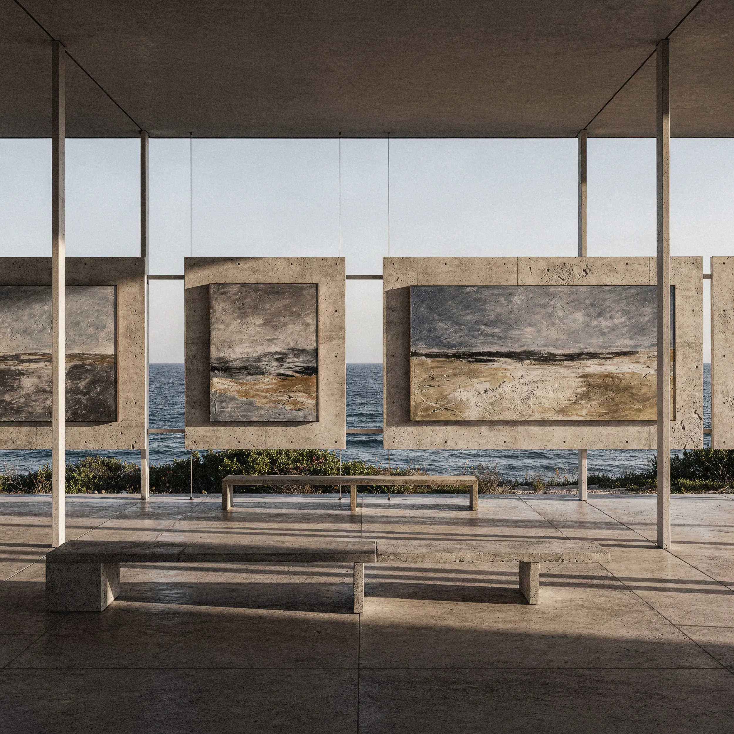 Die Architektur der Stille: Wo der Horizont zur Leinwand wird. Diese Visualisierung kombiniert rohen Brutalismus mit der Weite des Ozeans und zeigt, wie wir Marken und Kunstwerke in exklusiven, fiktiven Umgebungen inszenieren. Wir realisieren High-End-Konzepte für den Kunst- und Immobilienmarkt, die physische Grenzen und klimatische Herausforderungen einfach auflösen.