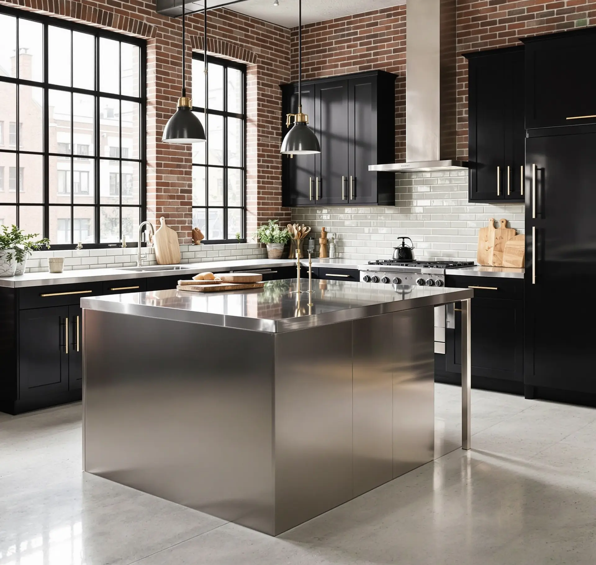 Industrieller Monolith: Die Symbiose aus roher Materie und präziser Fertigung. Diese Visualisierung zeigt, wie wir komplexe Oberflächen wie gebürsteten Edelstahl und rustikalen Backstein in einer harmonischen Lichtstimmung vereinen. Wir schaffen inspirierende Wohnwelten für Architekten und Interior-Brands, die ohne aufwendigen Setbau oder reale Immobilien-Shootings auskommen.