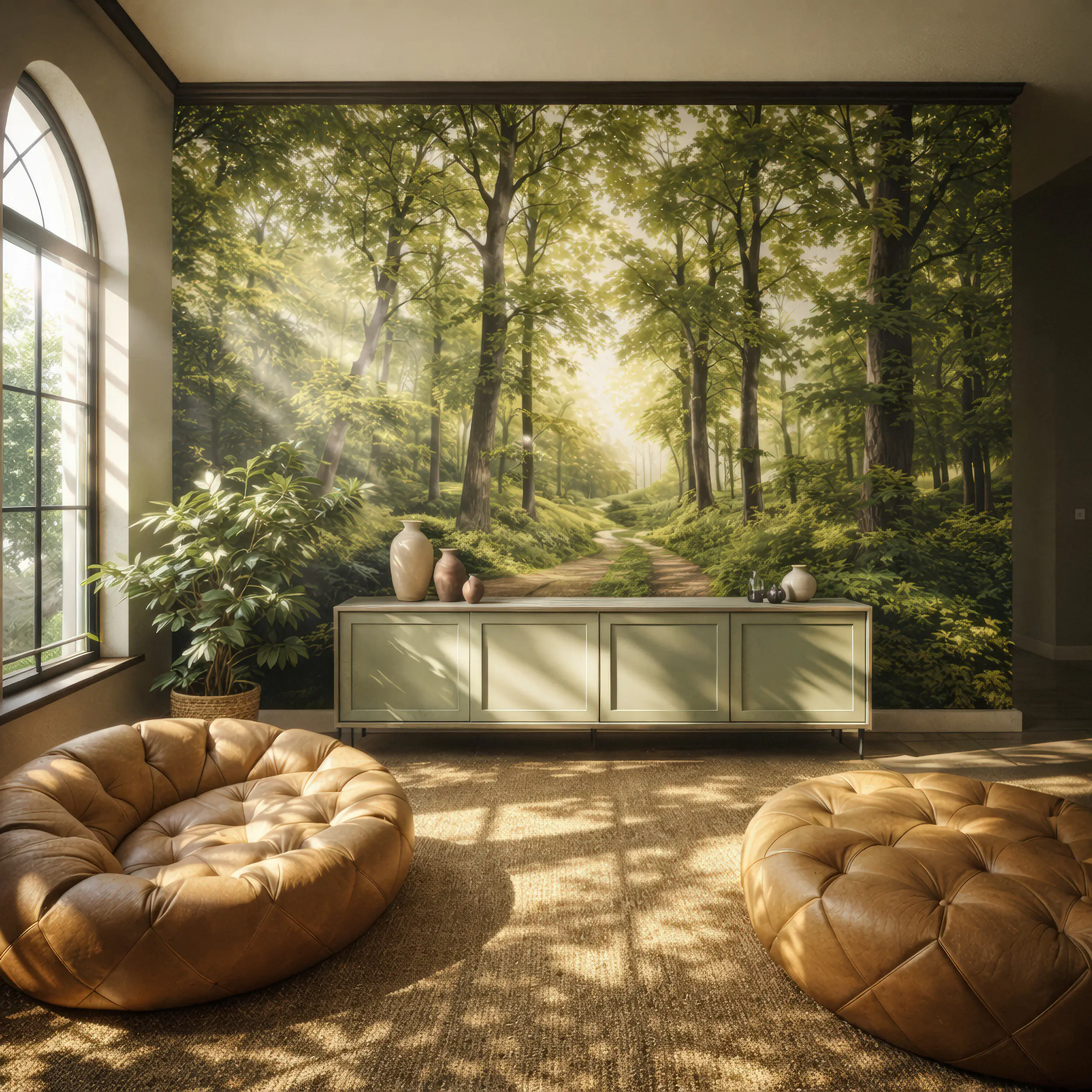 Immersion im Raum: Die Verschmelzung von Architektur und Naturästhetik. Dieses Setting demonstriert, wie wir visionäre Raumkonzepte und großformatige Interior-Kunst visualisieren können, ohne physische Muster oder kostspielige On-Location-Produktionen – inklusive einer physikalisch akkuraten Lichtinszenierung