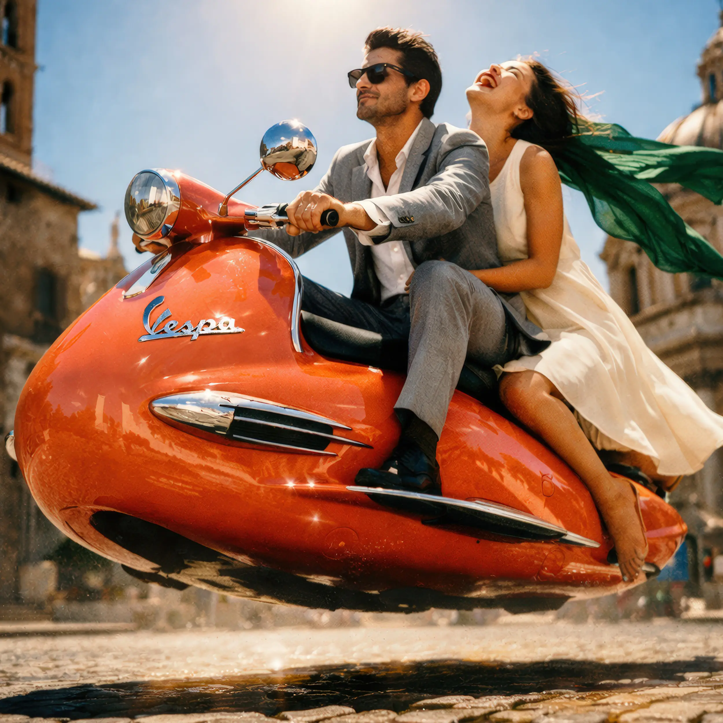 Reimagining Heritage: Grenzenlose Bildwelten ohne logistischen Aufwand. Diese Vision einer schwebenden Vespa verbindet klassische Markenästhetik mit futuristischem Storytelling – High-End Creative Direction, die Produktionszeit und Kosten radikal reduziert.